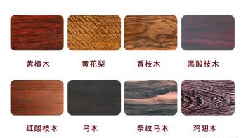 红酸枝类的心材呈紫淡褐色或红褐色。绝大多数沉于水中,纹路交叠,在径切面中常见有带条状的纹路。不易变形开裂,可防霉、防水、防腐。