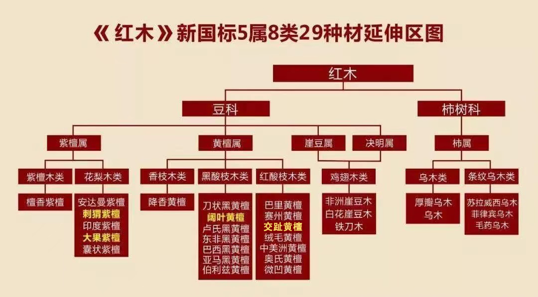 所谓“红木”,一开始就不是某一特定树种,而是明清以来对稀有硬木家具的统称。在 上世纪八十年代后,大家对红木家具的需求增加,国家根据密度等指标对红木进行了规范, 把红木规范为:二科、五属、八类、二十九种。红木是指这 5 属 8 类 29 种木料的心材,心 材是指树木的中心、无生活细胞的部分。